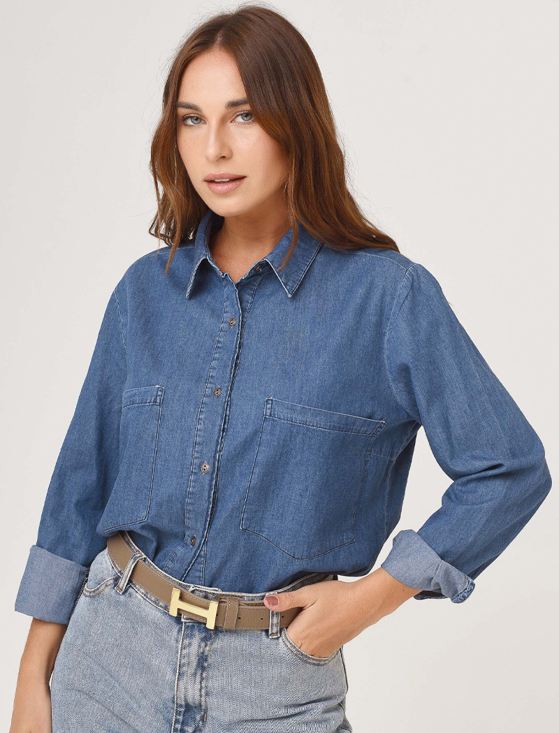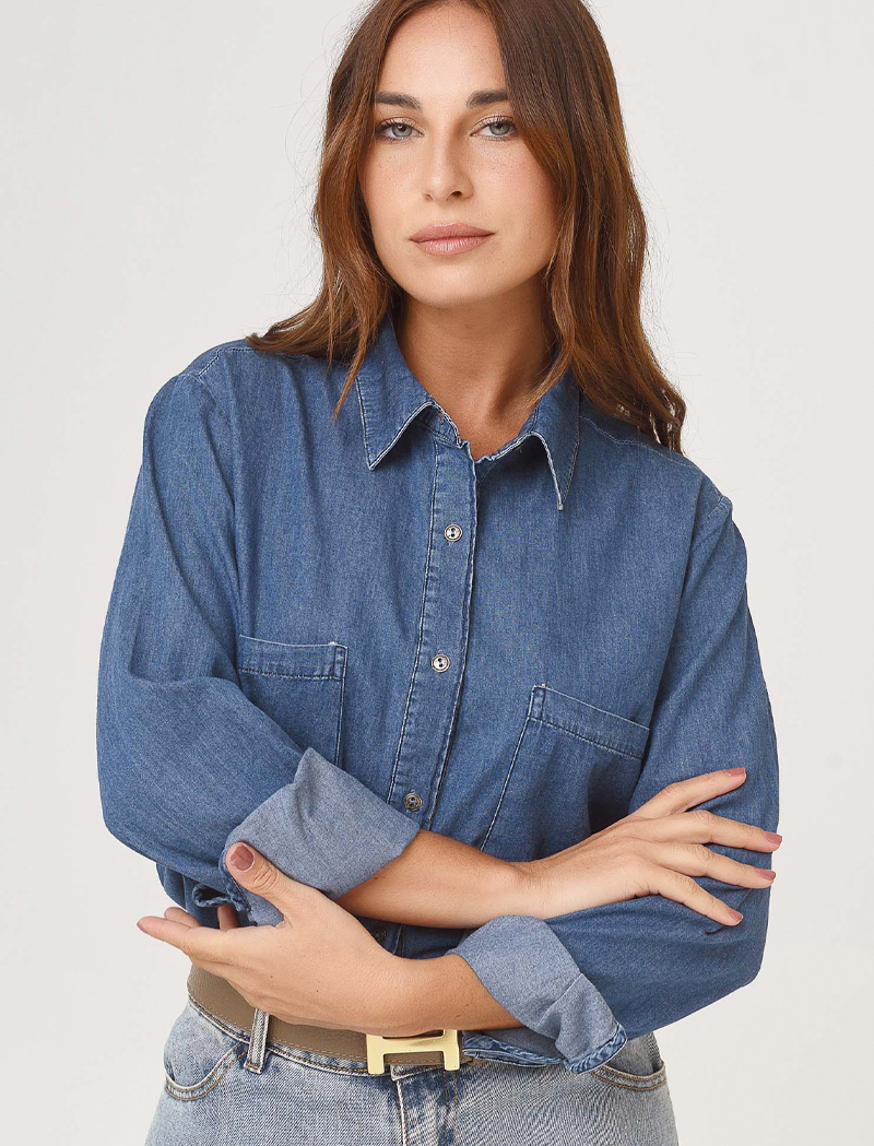 Camisa de jean livianito gastado. Abotonada al frente, cuellito camisa y puños con traba para levantar. Tiene 2 bolsillotes aplicados al frente.