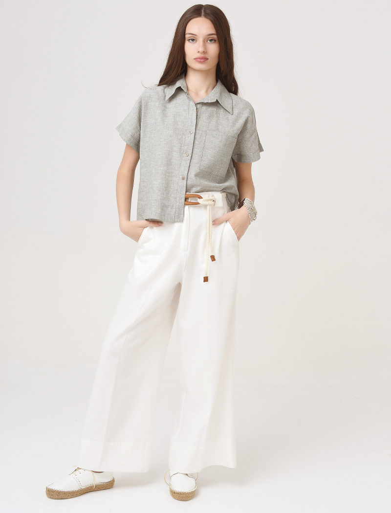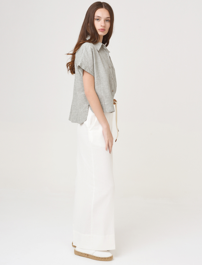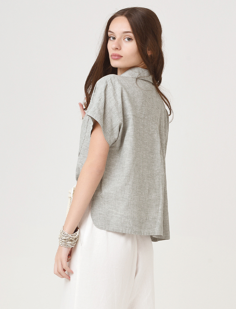 Camisa de voile de algodón y lino, de corte recto con zócalos en ruedos y manga japonesa terminada en puño para doblar.