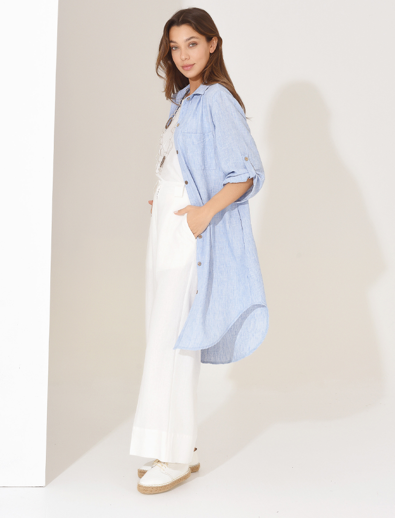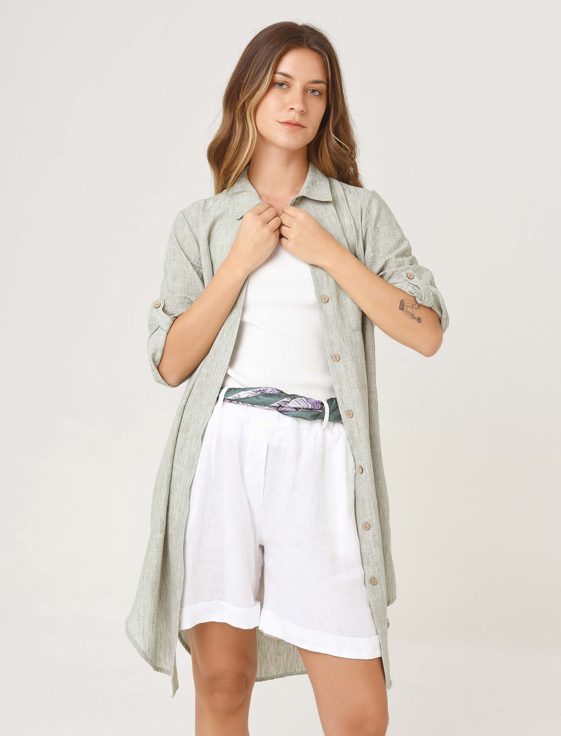 Es sábado por la mañana, el sol entra suave por la ventana y el plan es sin apuro: desayuno largo, una caminata cerca del mar o una tarde de terraza en la ciudad. Con la Camisa Solanas no hay complicaciones: su lino fresco y su corte amplio te invitan a moverte con libertad, mientras su diseño clásico con aires contemporáneos se adapta a cada momento del día.